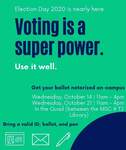 Election Day 2020 is nearly here Voting is a super power. Information about getting your ballot notarized on-campus. Bring a valid ID; ballot, and pen.