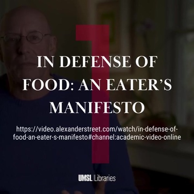 Post Description: This UMSL Library video recommends the most viewed title on Academic Video Online: "In Defense of Food: An Eater's Manifesto." Link here: https://video.alexanderstreet.com/watch/in-defense-of-food-an-eater-s-manifesto#channel:academic-video- -